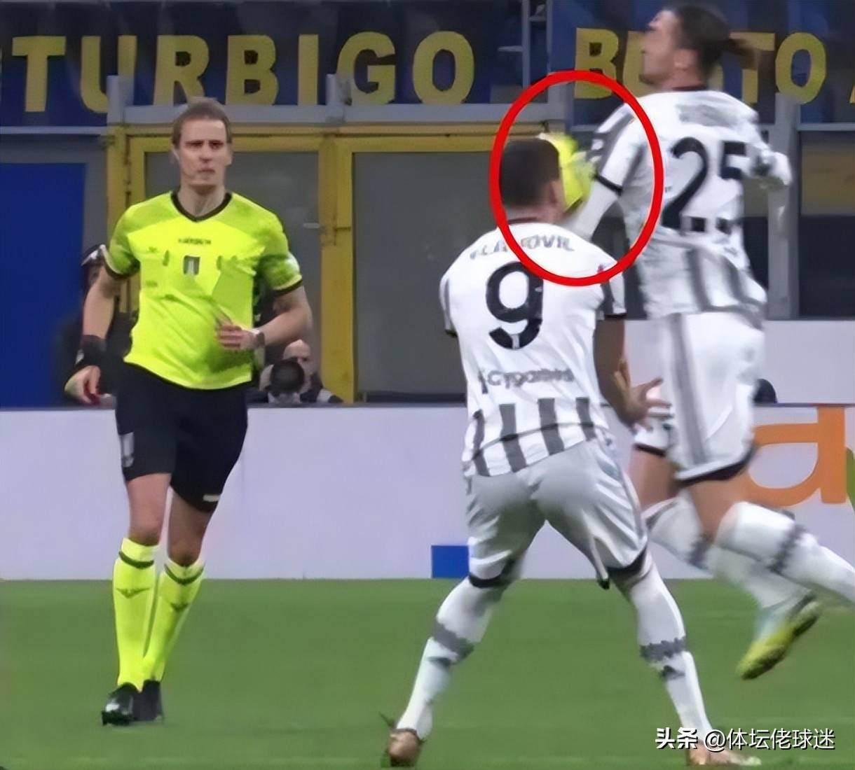 时间回溯到22/23赛季意大利国家德比的第二回合,尤文图斯客场1比0击败国际米兰。科斯蒂奇进球前,拉比奥在策动反击时,已经明显手球。主裁判基菲近在咫尺,却选择无视。即使VAR介入,这粒进球依然被判有效。更令人难以置信的是,在这次进攻中,为科斯蒂奇送上助攻的弗拉霍维奇,同样在推进过程中手臂触球。两位尤文球员接连手球犯规,却被裁判和VAR选择性忽视,最终成就了科斯蒂奇的进球。
